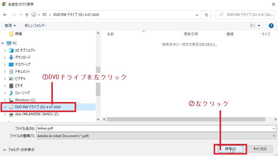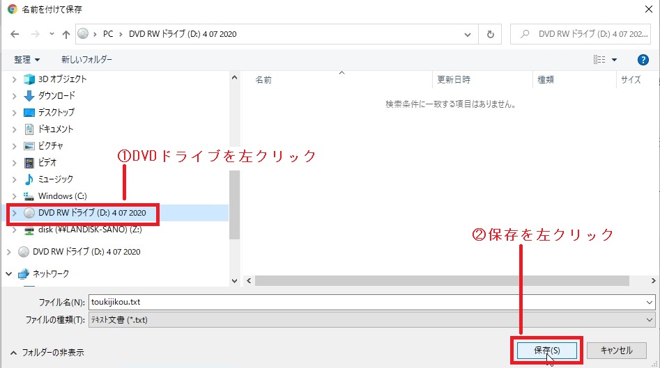 ①名前を付けて保存ダイアログが表示されますので、DVDドライブを左クリックしてください。