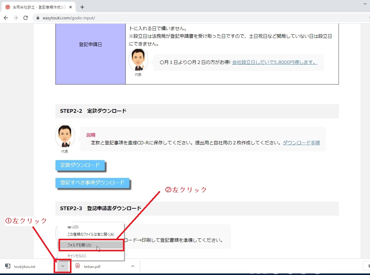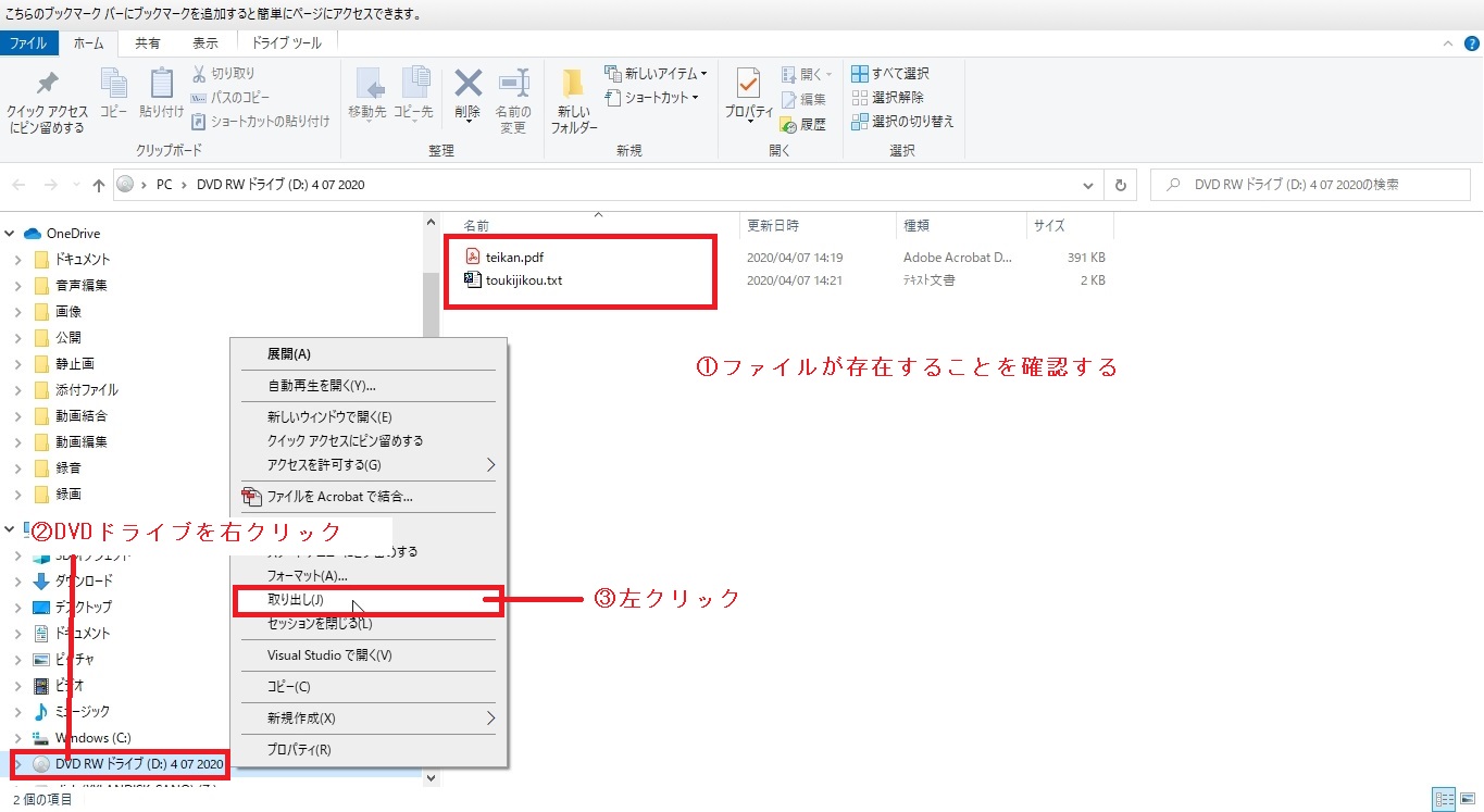 ①エクスプローラが開きますので、「teikan.pdf」と「toukijikou.txt」があるか確認してください。