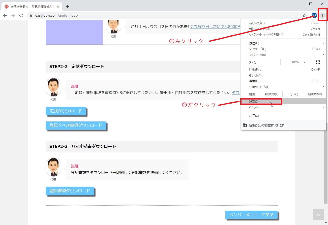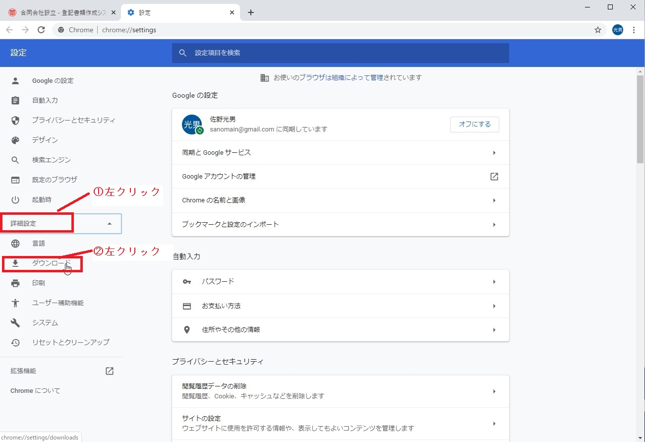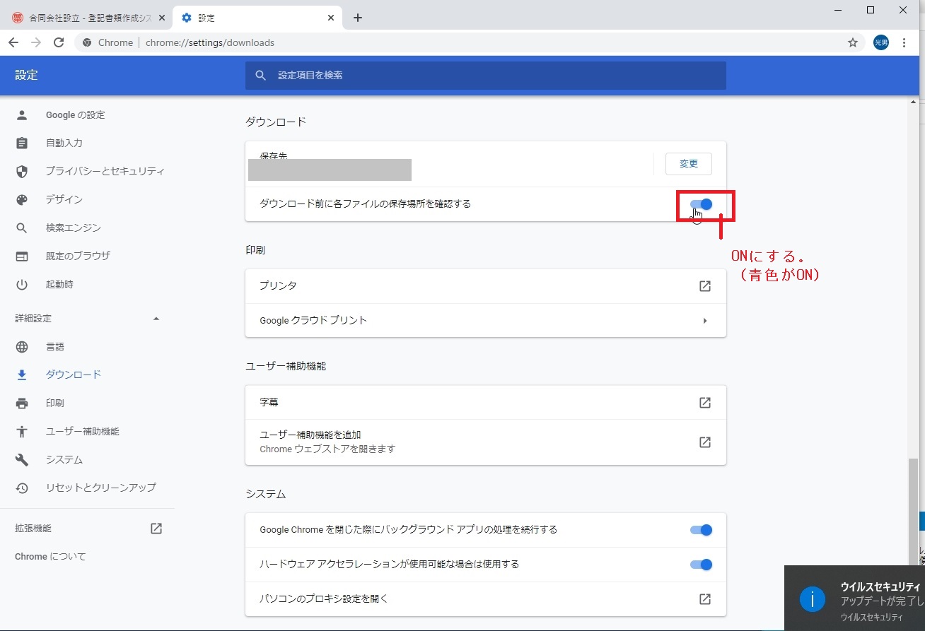 [speech_bubble type=”fb” subtype=”L1″ icon=”sano.jpg” name=”代表”]ブラウザのダウンロード時の動作の設定をしてください。