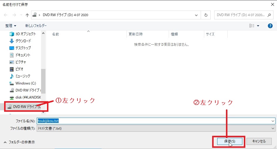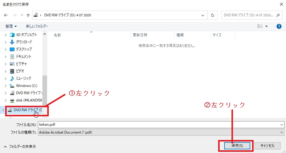 ①名前を付けて保存ダイアログが表示されますので、DVDドライブを左クリックしてください。