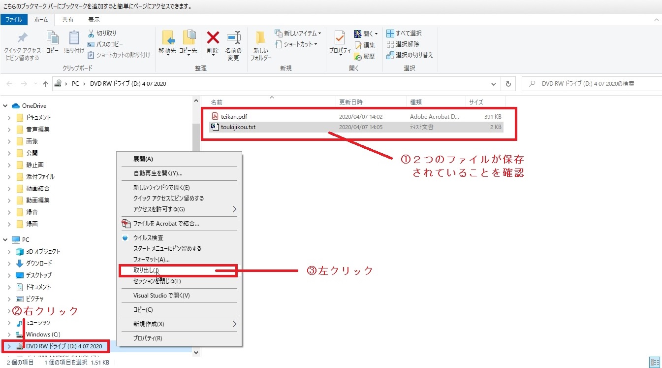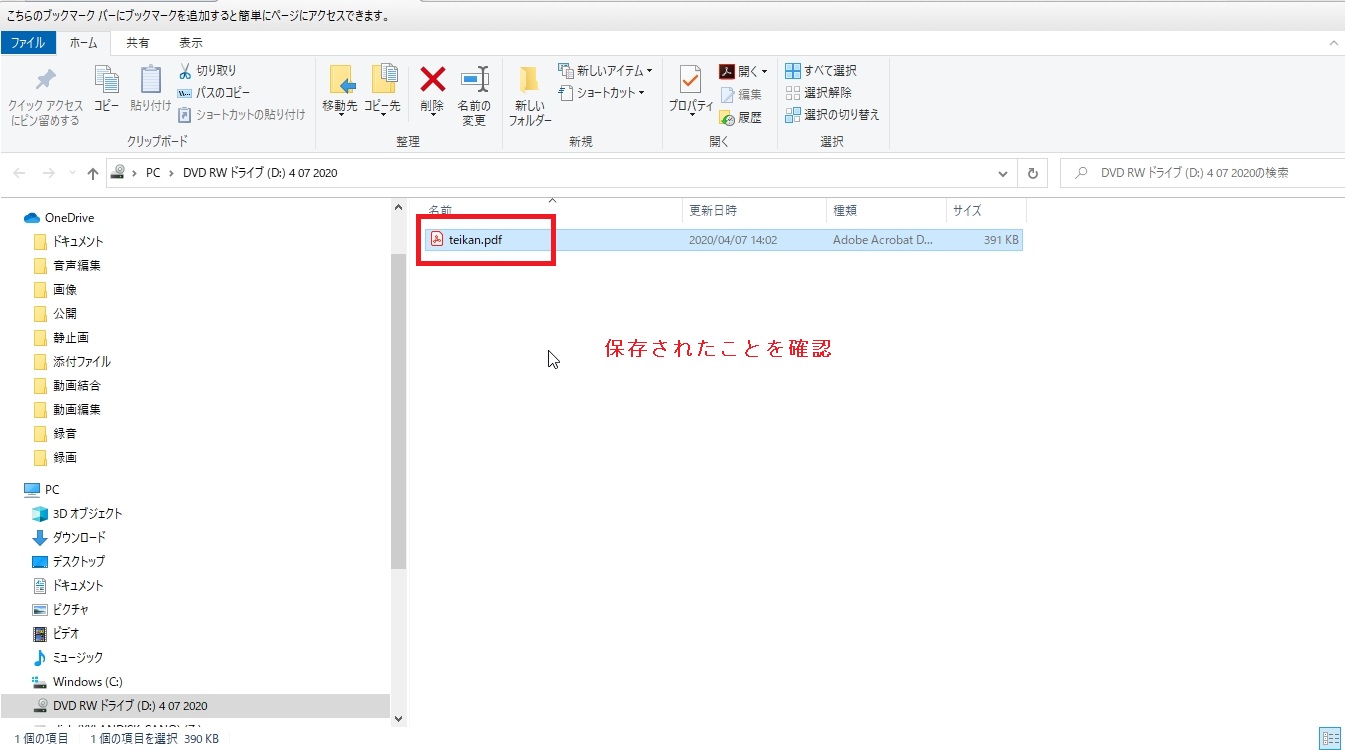 ①エクスプローラが開きますので、「teikan.pdf」と「toukijikou.txt」があるか確認してください。