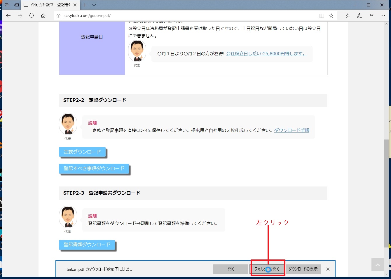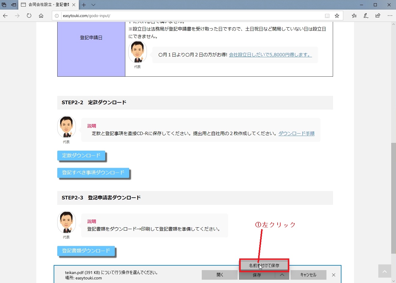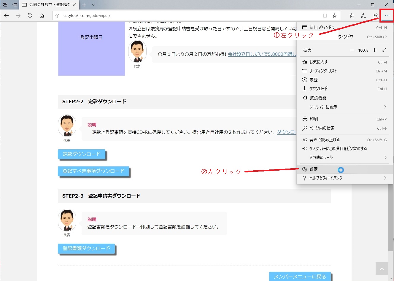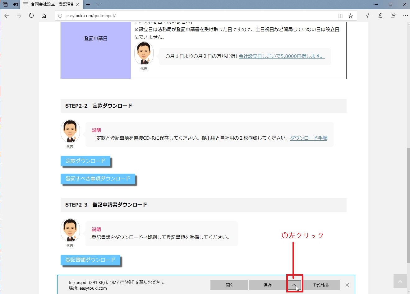 ①「定款ダウンロード」を左クリックしてください。