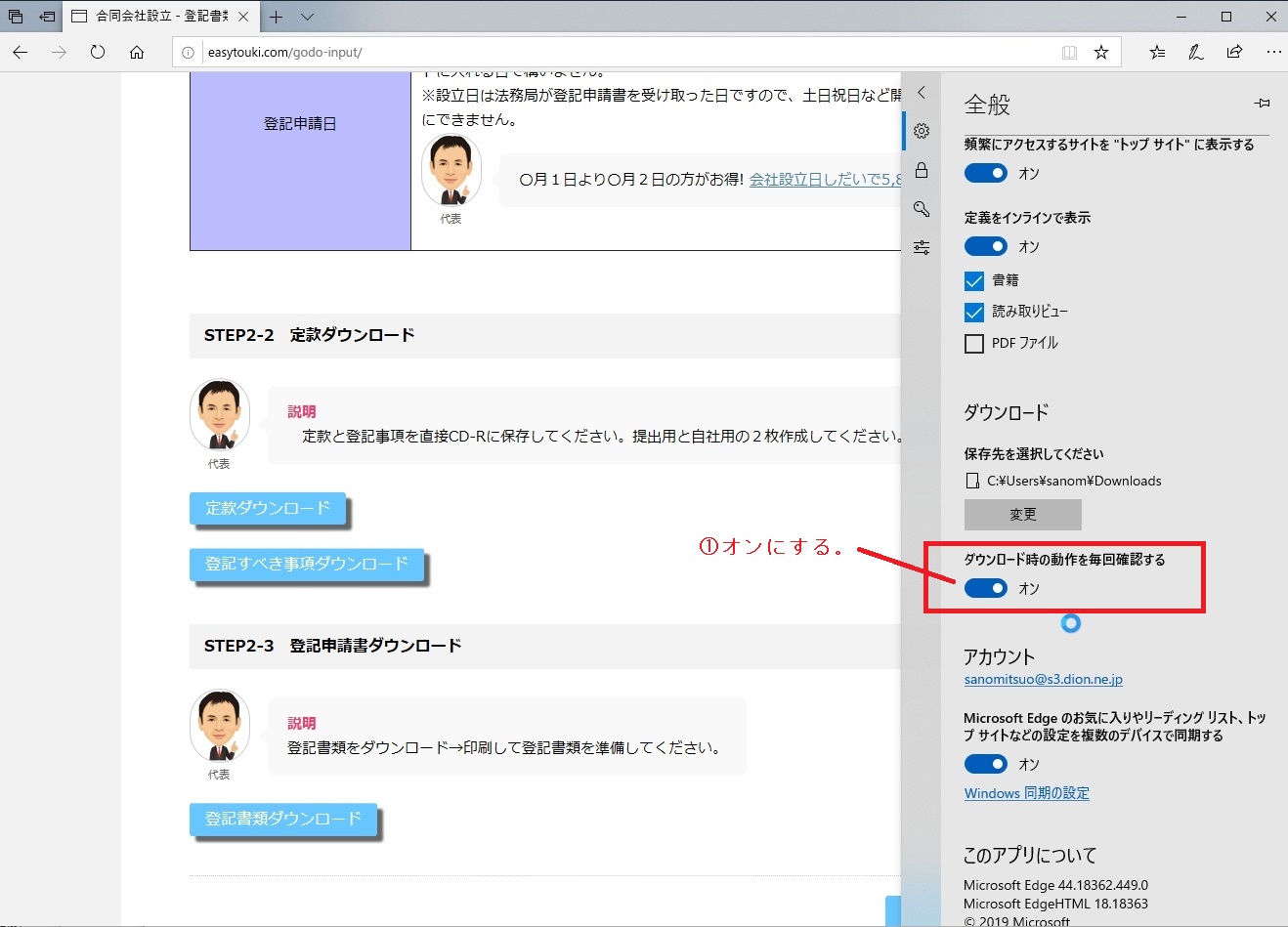 ①メニューが表示されますので、「ダウンロード時の動作を毎回設定する」をONにしてください。