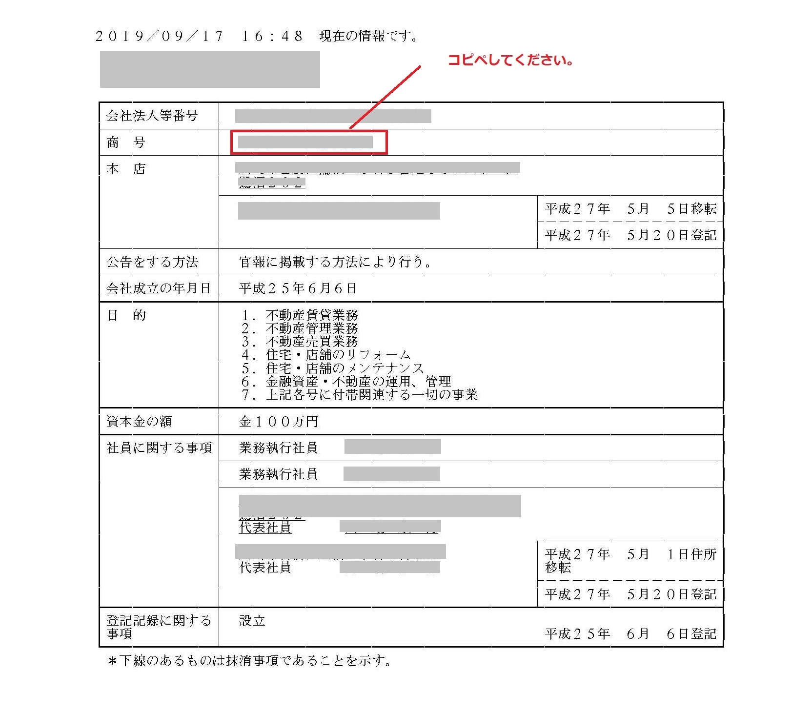 商号は登記簿をコピーしてください。