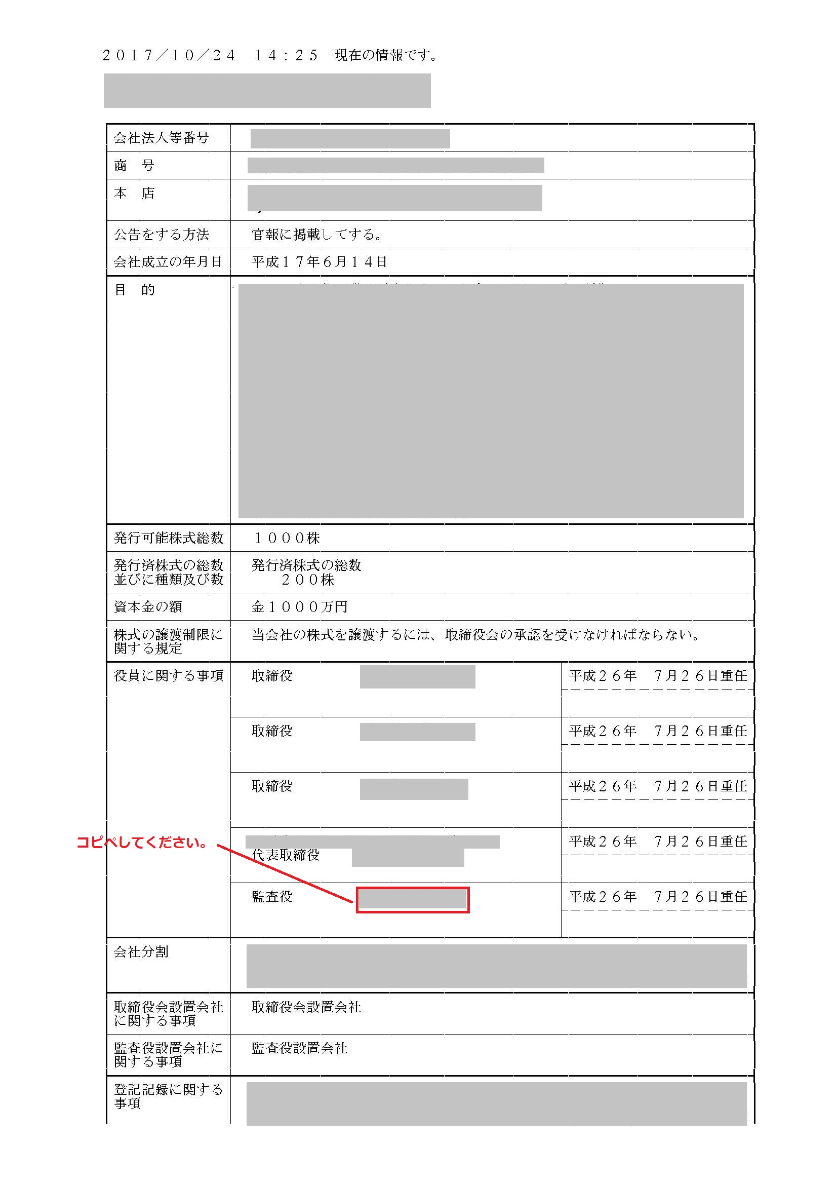 監査役は登記簿から求めてください。