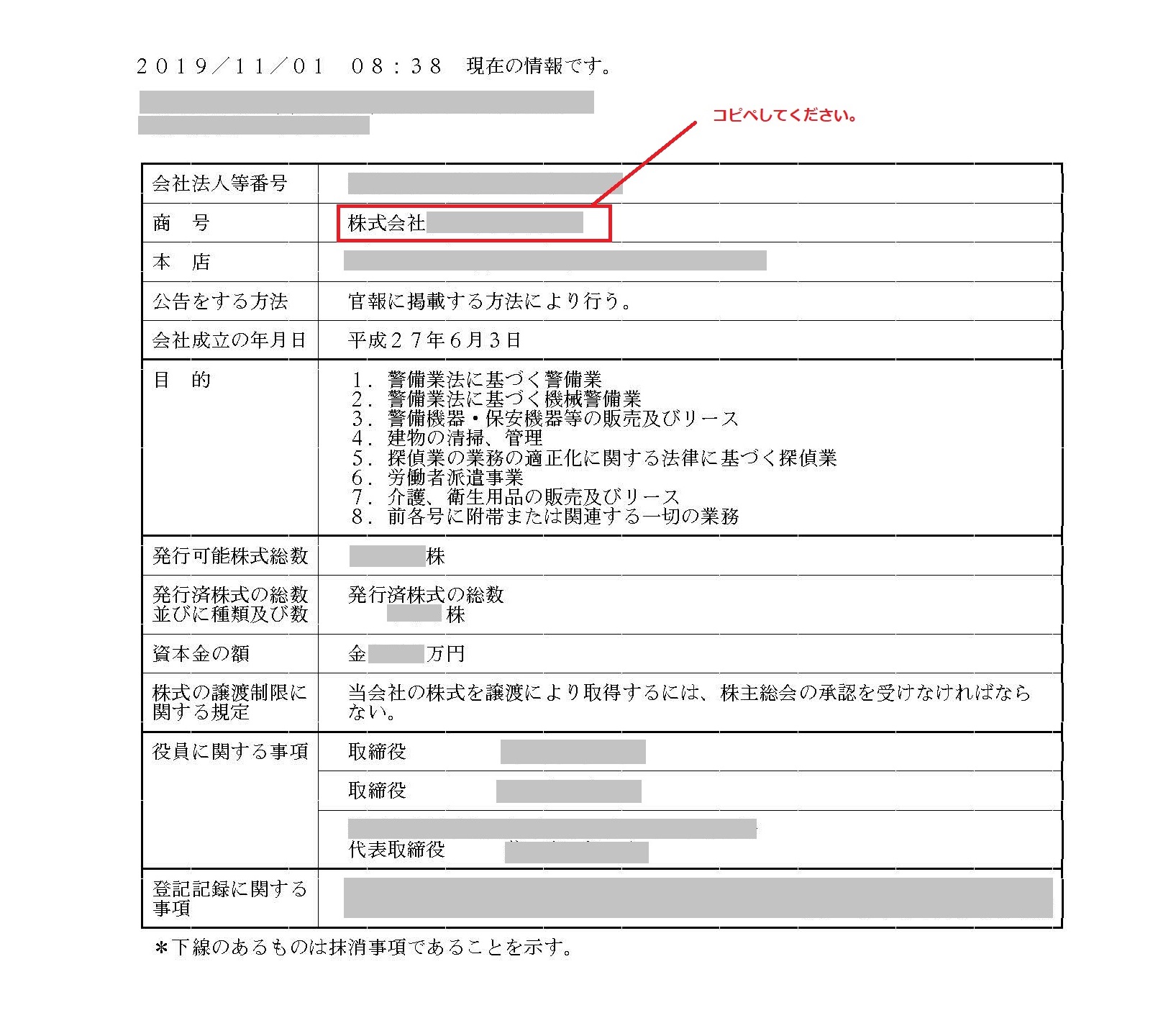 商号は登記簿を参照してください。登記簿が手元にない場合は商号の検索をご覧ください。ください。