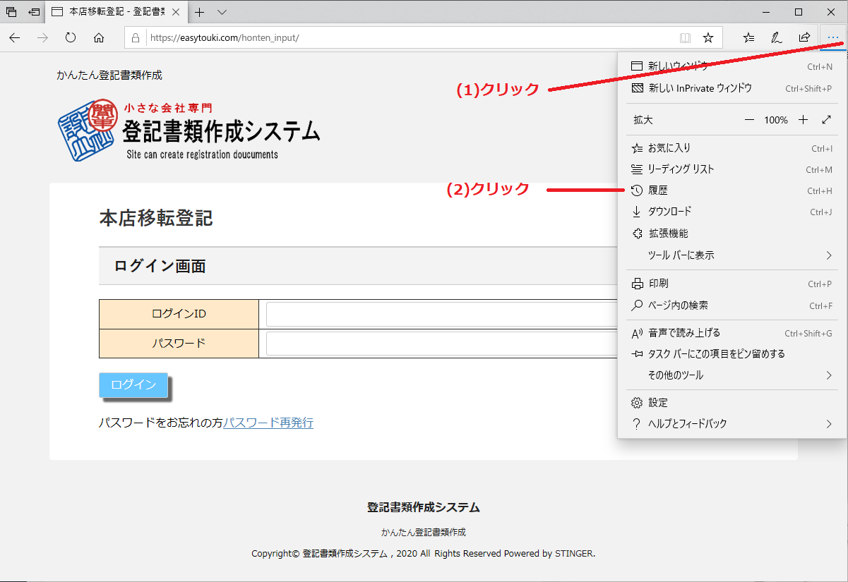 1.Edgeブラウザの右上にある「…」設定アイコンをクリック「履歴」を選択します。